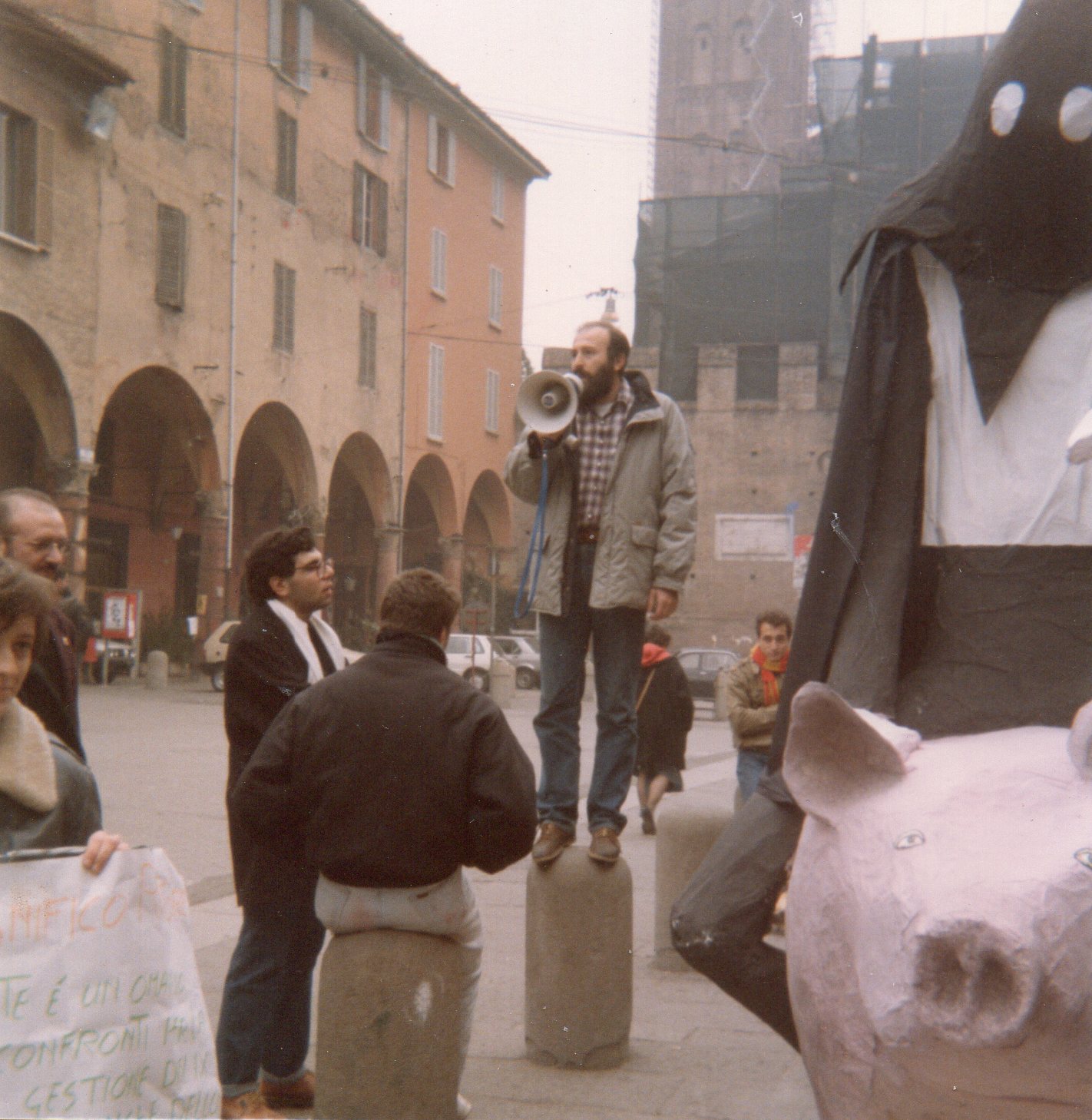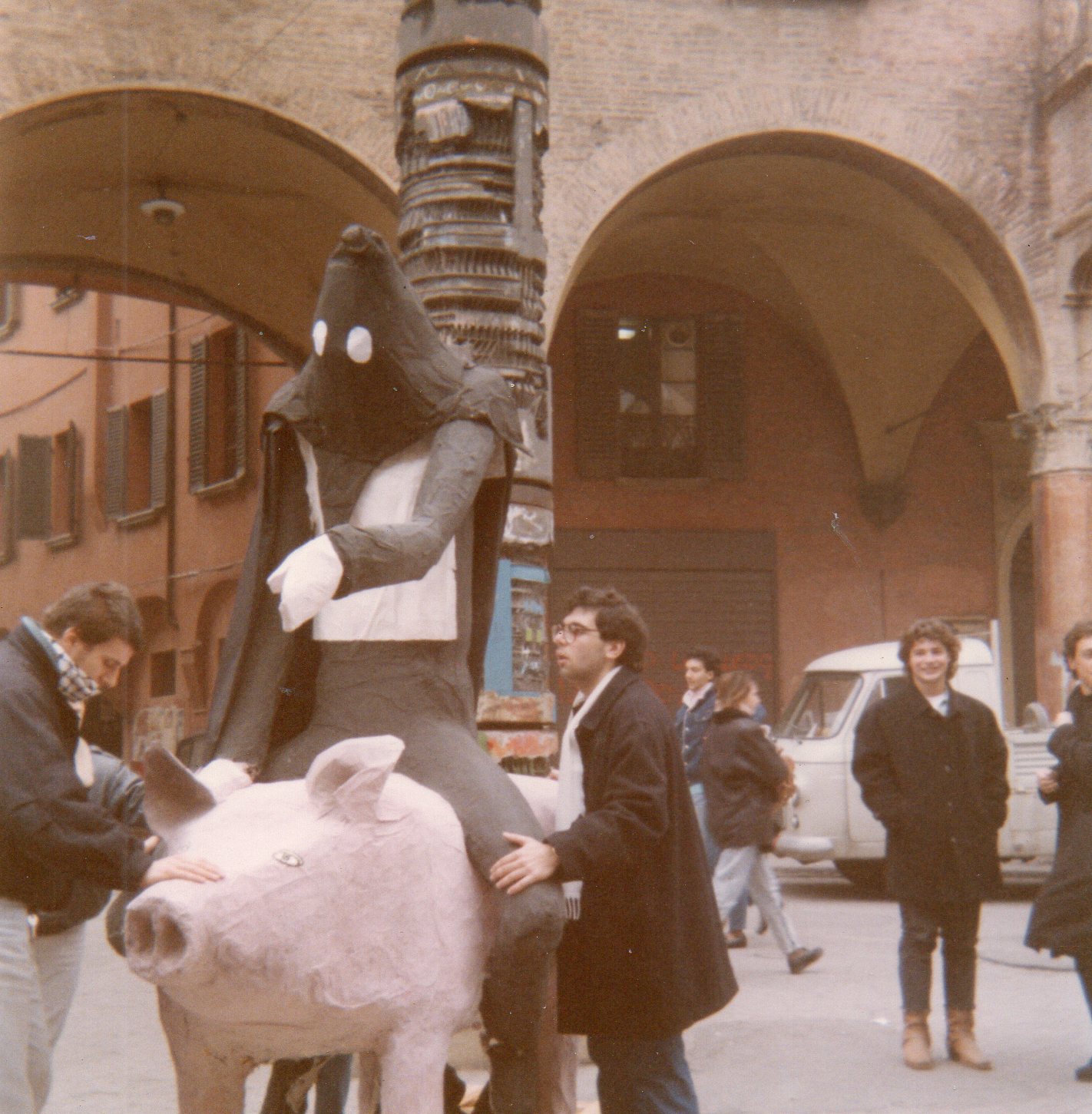La statua "equestre" del Rettore passa in via Zamboni accompagnata da militanti della sezione universitaria di Dp con cappucci massonici |