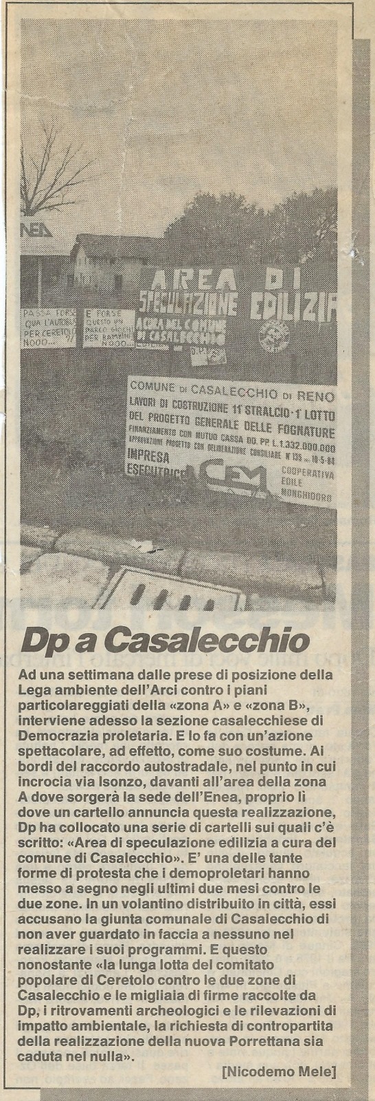 Articolo del "Carlino" del 25 novembre 1989 su una iniziativa di Dp di Casalecchio contro la speculazione edilizia |