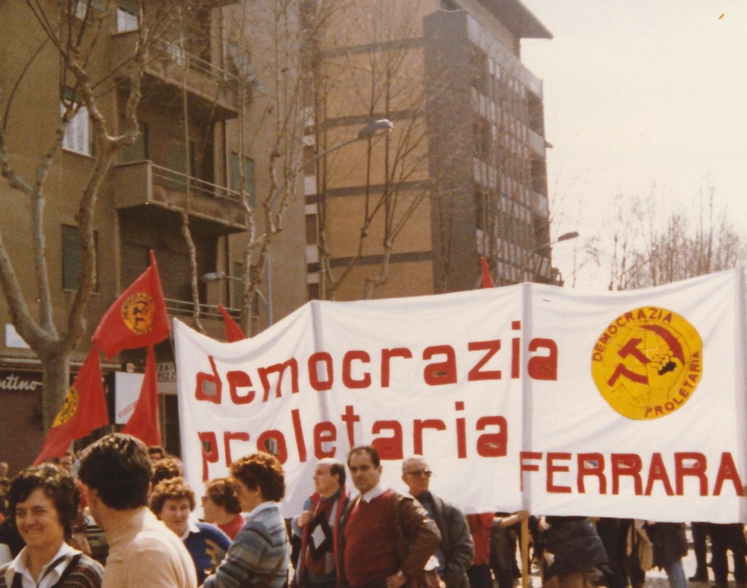 Roma, 24 marzo 1984, striscione di Dp di Ferrara alla manifestazione contro il taglio della scala mobile. |
