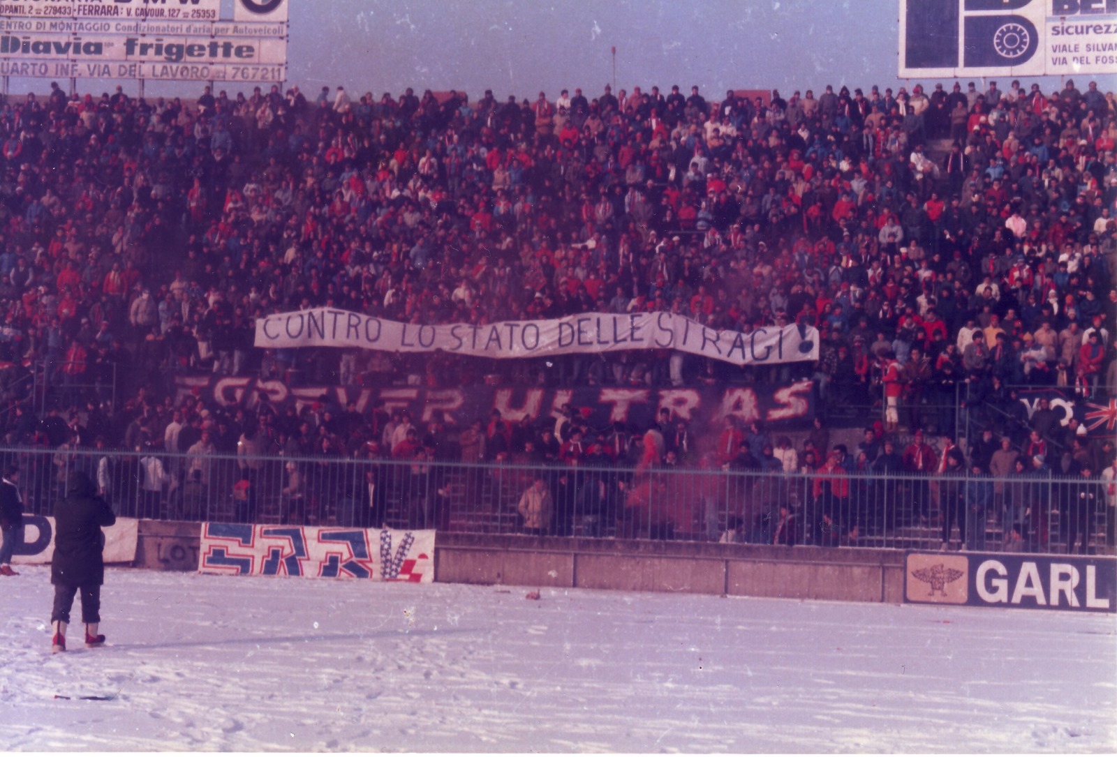 Stadio di Bologna, 6 gennaio 1985, striscione degli ultras del Bologna contro la strage del 23 dicembre 1984. Lo striscione fu realizzato su proposta di Marco Odorici "Oddo", ultras e militante di Dp |
