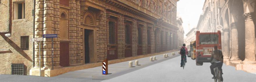 Il progetto, già previsto nell'ambito del programma "Di nuovo in centro" e realizzato da Betarchitetti, consiste nell’allargamento del percorso pedonale esistente fino a 3,3 metri attraverso la realizzazione di nuova pavimentazione rialzata in lastre di arenaria grigia, al posto dei parcheggi che oggi ostruiscono la facciata di uno dei più bei palazzi del rinascimento bolognese.