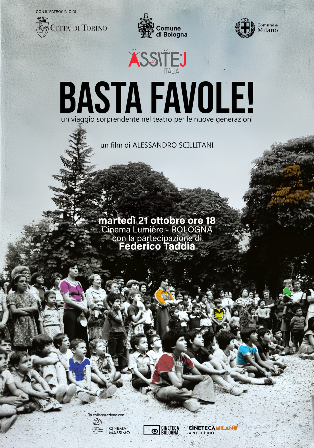L’appuntamento con la prima bolognese di Basta favole!, il docufilm diretto da Alessandro Scillitani e promosso da Assitej Italia (Associazione Nazionale del Teatro per l’Infanzia e la Gioventù), è martedì 21 ottobre alle 18 al Cinema Lumière (ingresso gratuito su prenotazione online), in collaborazione con la Cineteca di Bologna e con l' introduzione a cura del conduttore televisivo e radiofonico Federico Taddia. La proiezione è inserita nel programma delle Settimane Pedagogiche 2025 del Comune di Bologna.