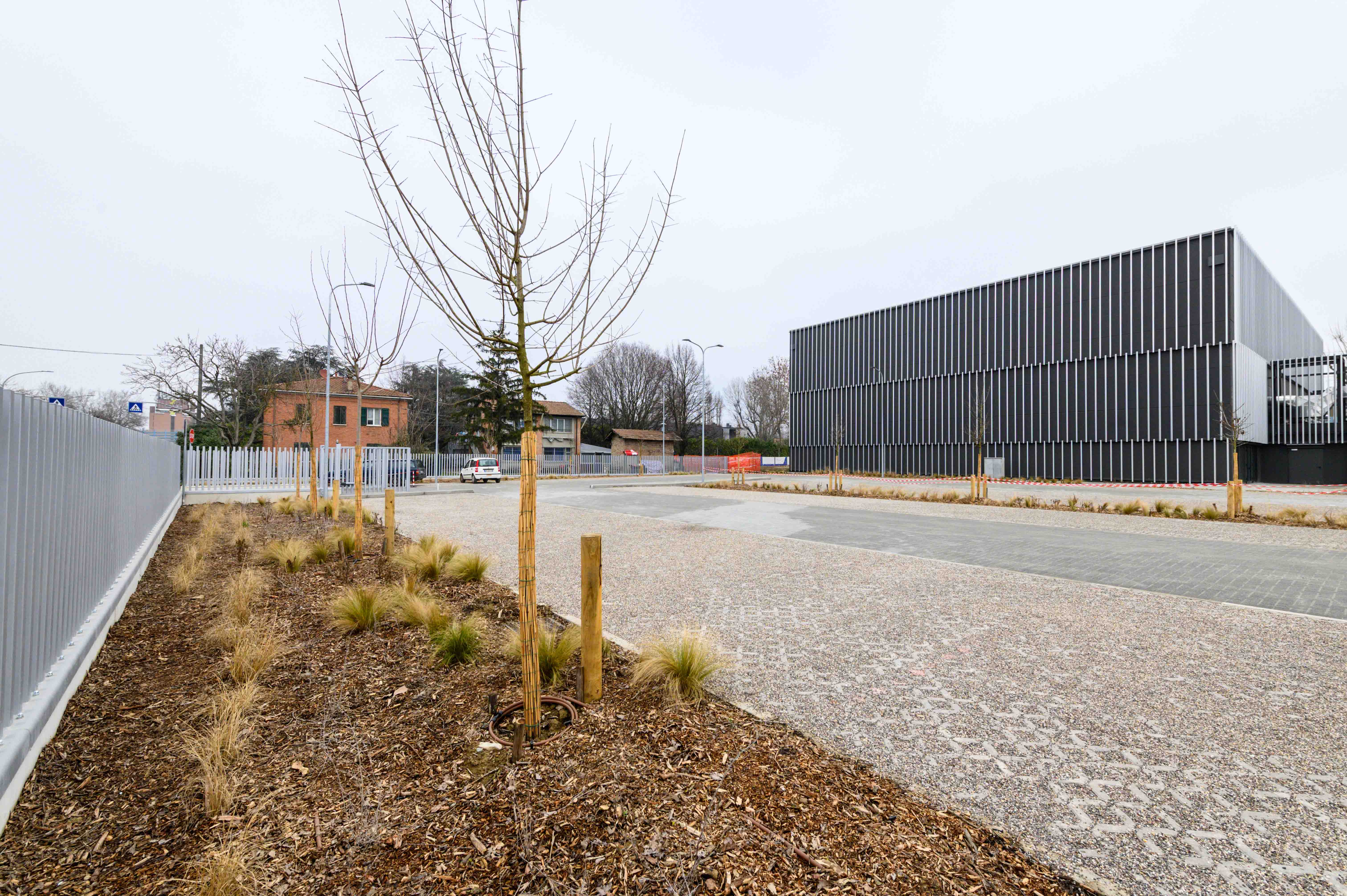 L’attenzione all'ambiente prosegue anche all'esterno: il verde pubblico che circonda l'area è servito da un sistema di irrigazione intelligente che utilizza prioritariamente l’acqua piovana recuperata.