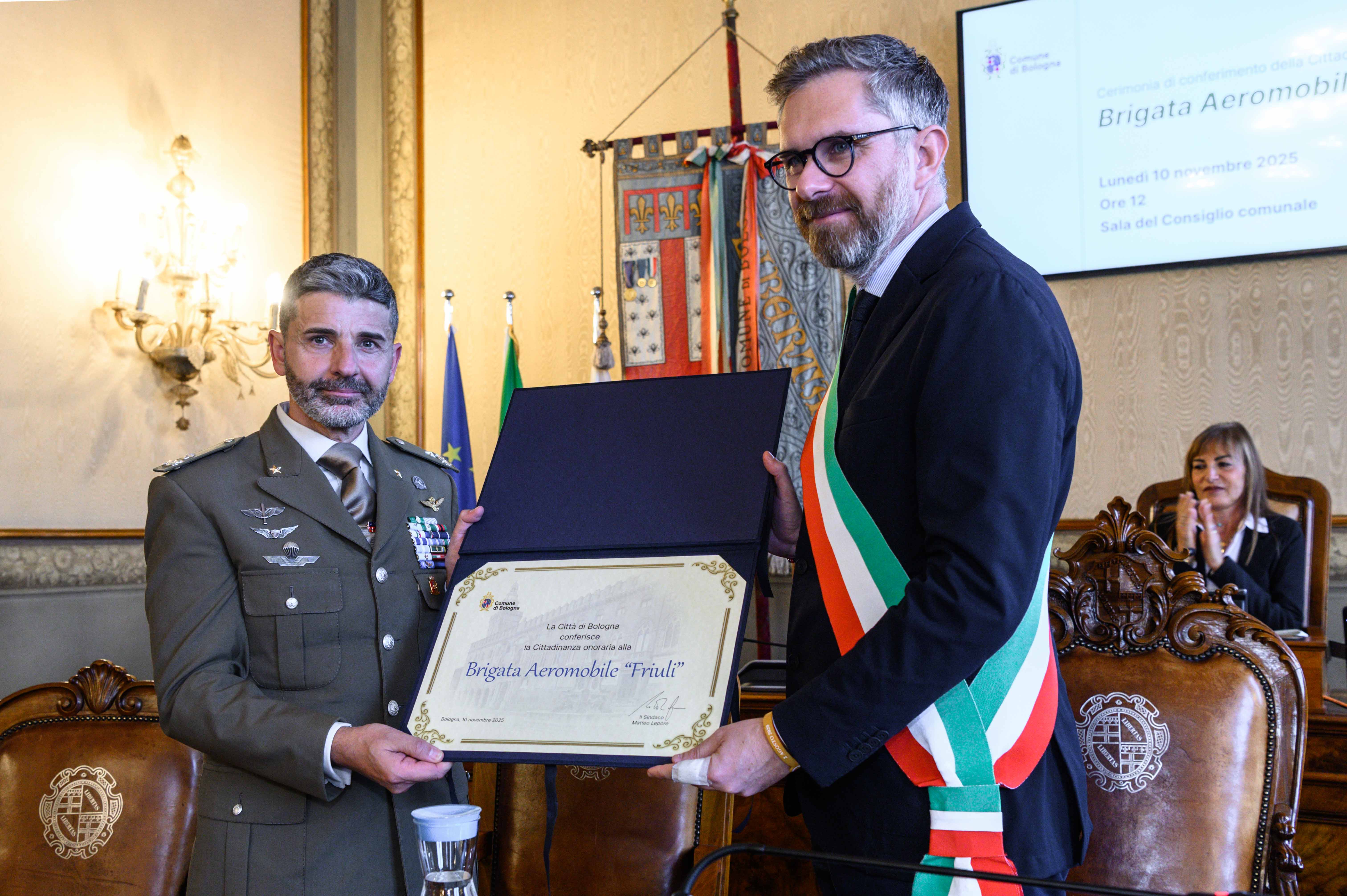 Si è tenuta questo pomeriggio, nella Sala del Consiglio comunale a Palazzo d'Accursio, la cerimonia di consegna della cittadinanza onoraria alla Brigata Aeromobile “Friuli”. Successivamente è stato firmato il Libro d’onore in sala Rossa.