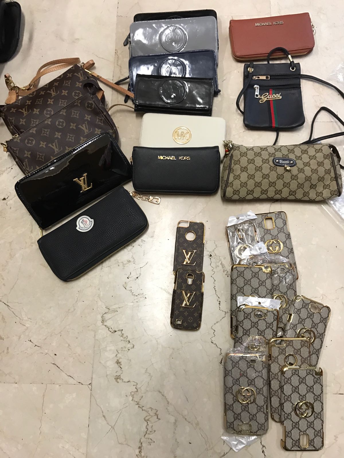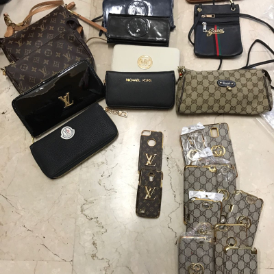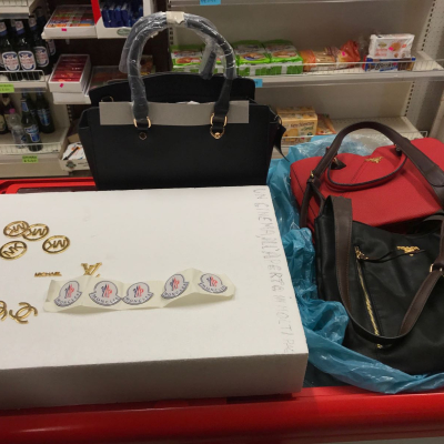 Nel retro di un negozio borsoni già pronti con capi di abbigliamento con marchi contraffatti