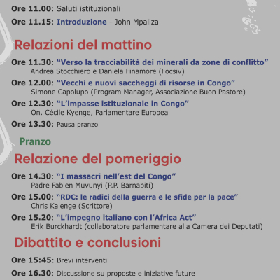 Oltre ad esplorare ed approfondire le questioni oggi più rilevanti per il Congo, dall'impasse istituzionale all'insicurezza che sta impedendo a vaste zone del paese di svilupparsi, si discuterà delle iniziative che si stanno mettendo in atto in Europa e nel mondo per cercare di costruire un futuro migliore per il grande paese africano, in particolare le proposte al vaglio della Comunità Europea per introdurre la tracciabilità dei minerali provenienti da zone di conflitto.