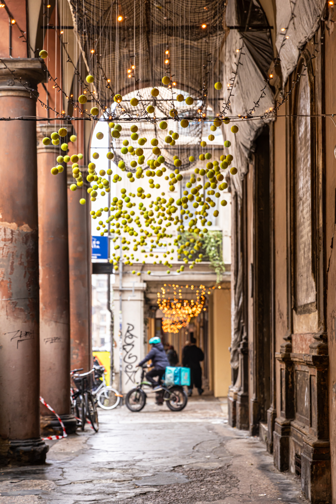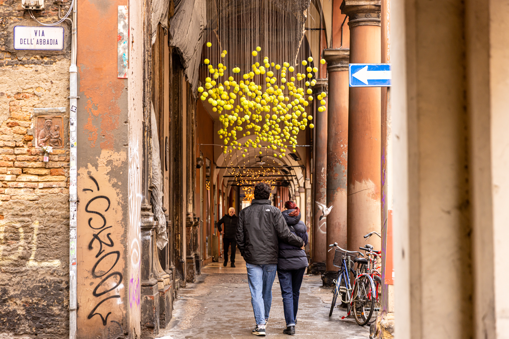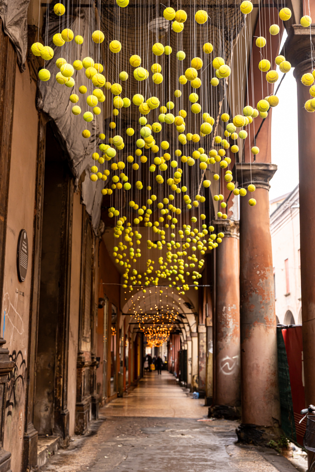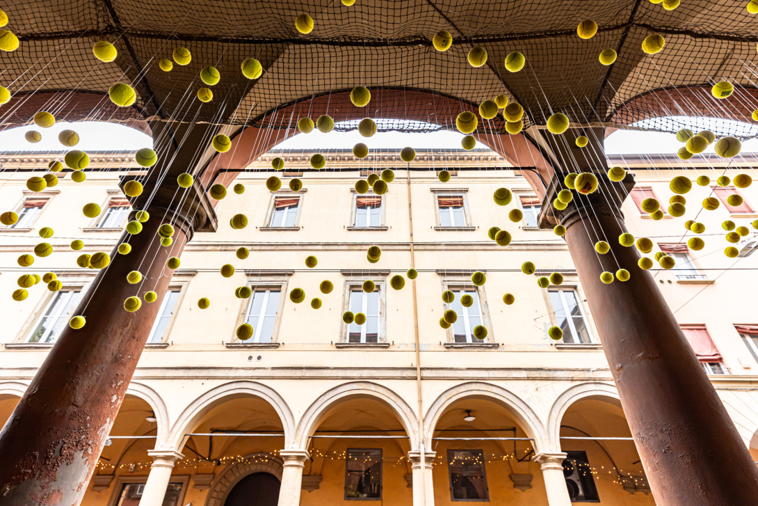Si chiama Second Serve ed è stata realizzata da MAAP, il collettivo femminista che si occupa di arte pubblica e rigenerazione. L’opera comparsa da qualche giorno sotto al portico dell’ex chiesa di San Nicolò in via San Felice è realizzata con 500 palline da tennis appese a due reti da tennis con filo trasparente in nylon.