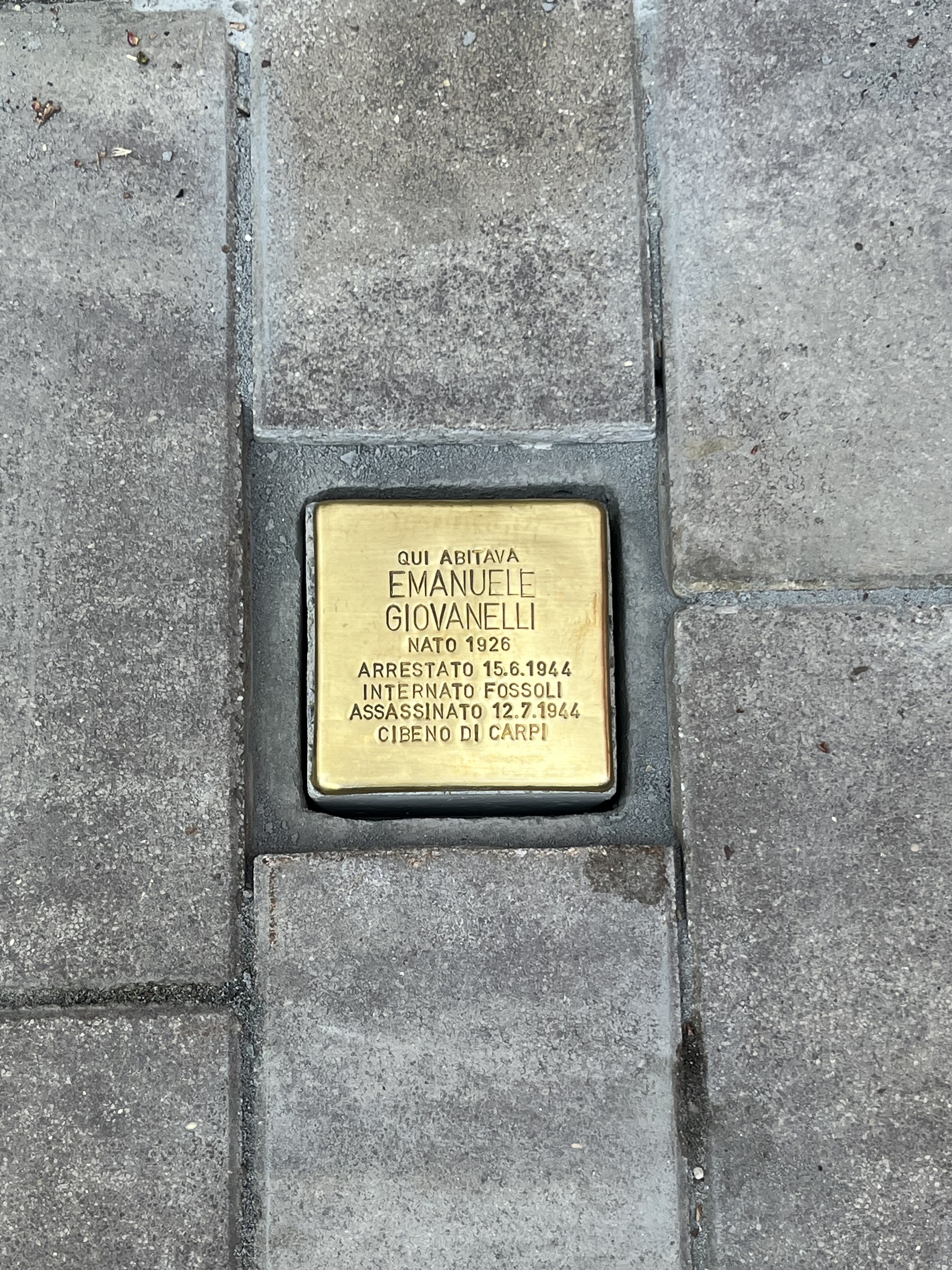 Infine, in viale Oriani 26, è stata deposta la pietra d'inciampo dedicata a Emanuele Giovanelli. Erano presenti l’assessore Daniele Ara, la presidente del Quartiere Santo Stefano Rosa Maria Amorevole, la presidente della Fondazione Fossoli Manuela Ghizzoni e una classe dell'Istituto Comprensivo 21.