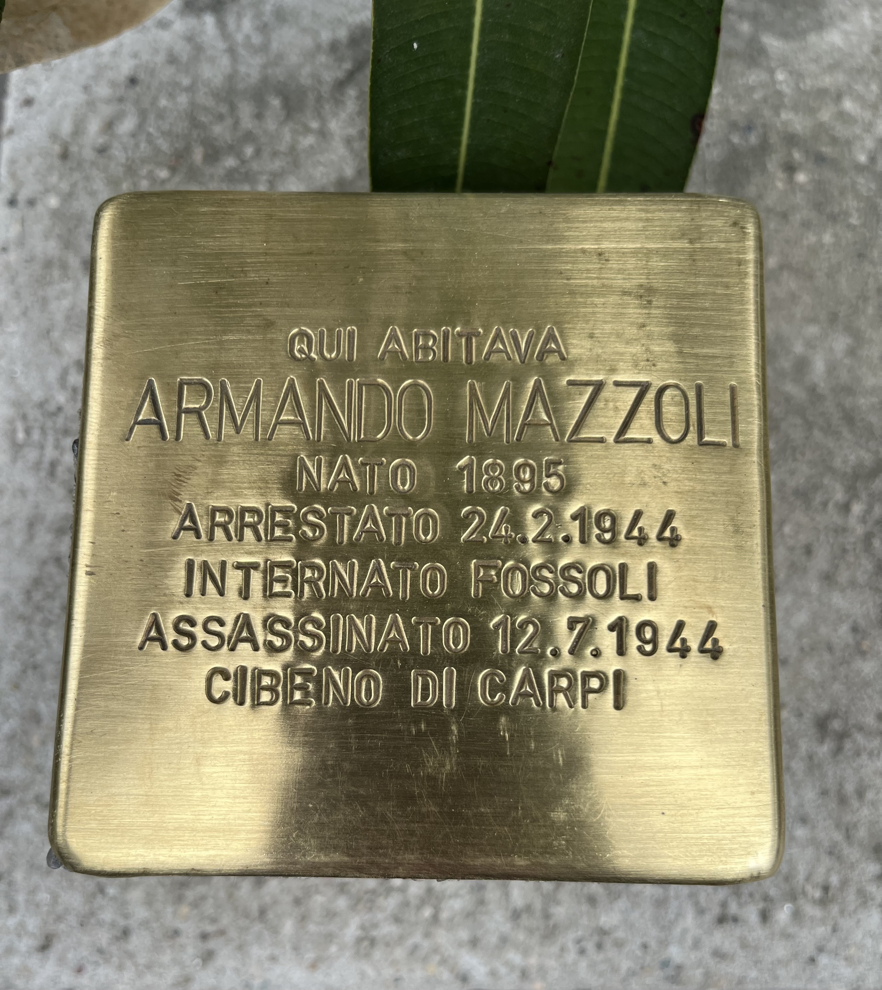 In via Rimesse 12 è stata deposta la pietra d'inciampo dedicata ad Armando Mazzoli. Erano presenti l’assessore Daniele Ara, il presidente del Quartiere San Donato-San Vitale Andrea Serra, la presidente della Fondazione Fossoli Manuela Ghizzoni e la classe 3E della scuola secondaria di primo grado Jacopo della Quercia.