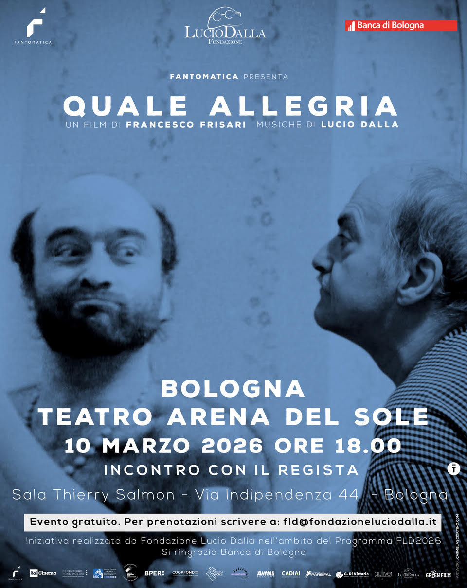 Martedì 10 marzo alle 18, al Teatro Arena del Sole (sala Thierry Salmon), si terrà inoltre la proiezione del docu-filmQuale allegria di Francesco Frisari, preceduta dall’incontro con il regista. L’iniziativa è a ingresso libero fino ad esaurimento dei posti disponibili, per prenotazioni scrivere a fld@fondazioneluciodalla.it