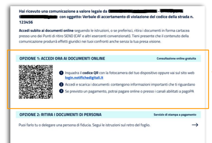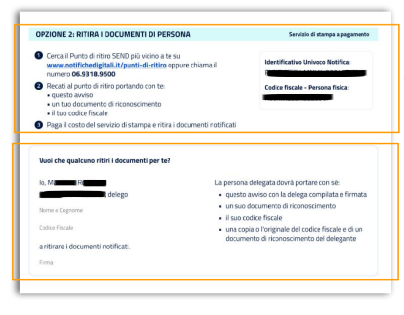 Se il destinatario non ha una PEC o non è registrato sulla piattaforma SEND, la notifica sarà gestita tramite invio di un avviso cartaceo con raccomandata postale. Questo avviso non conterrà l'atto intero, ma le istruzioni dettagliate (incluso un QR code) per accedere tramite SPID/CIE alla piattaforma SEND e visionare l'atto completo online o, in alternativa, per ritirarlo di persona presso i Punti di ritiro abilitati (come i CAF convenzionati), previo pagamento delle spese di stampa. È possibile delegare un soggetto diverso al ritiro della copia cartacea del documento notificato tramite SEND compilando l’apposito spazio dedicato presente nell’avviso cartaceo ricevuto.