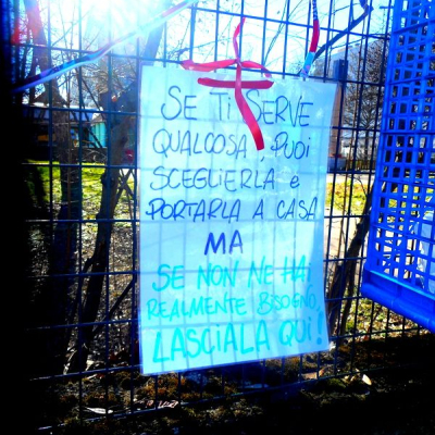 Sul muro il messaggio è chiaro ed è stato scritto su un cartello “Se ti serve qualcosa puoi prenderla e portarla a casa MA, se non ne hai realmente bisogno LASCIALA QUI!”.