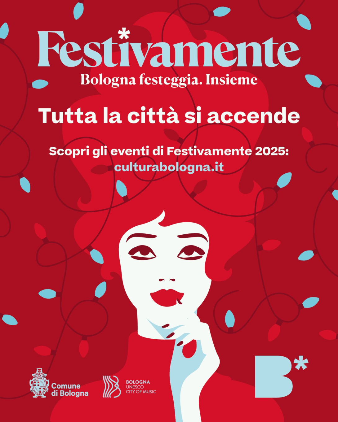 Festivamente diffonde la sua magia in tutta la città a partire da Via Indipendenza che si illumina d'autore. Il Comune di Bologna qui celebra la riapertura della strada, riqualificata dai lavori del tram, con una novità: le luminarie d'artista che si stagliano sul cielo invernale con i versi di Bologna è una regola di Luca Carboni, unendo Piazza Maggiore a Porta Galliera in un tributo a Bologna Città della Musica UNESCO.