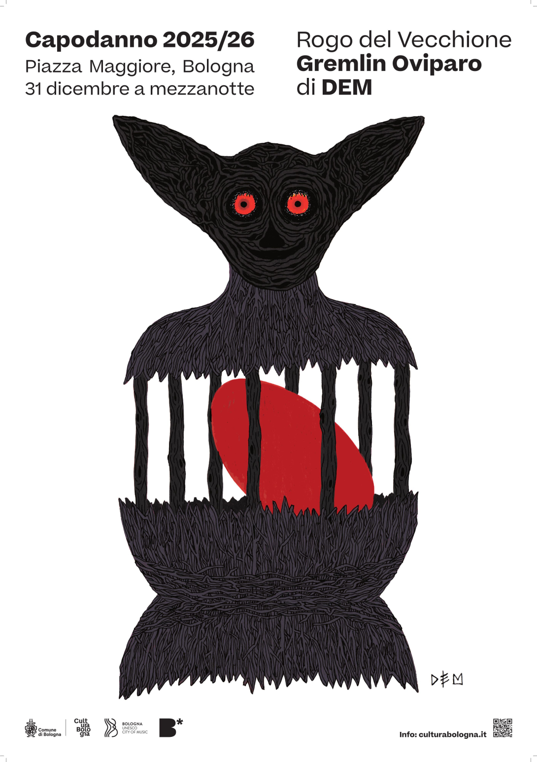 Il Vecchione d’Artista che brucerà simbolicamente le brutture dell’anno 2025 in un rito benaugurale di saluto all’anno nuovo è Gremlin oviparo, a firma DEM al secolo Marco Barbieri, artista poliedrico che spazia dalla land art alla wall painting.