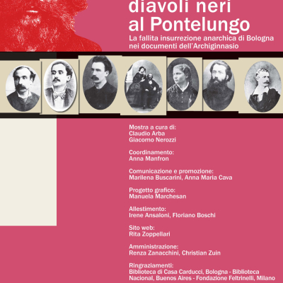 Dal 1°maggio al 19 giugno negli spazi del Quadriloggiato superiore della Biblioteca dell'Archiginnasio, in Piazza Galvani 1, si potra° visitare a mostra 1874: diavoli neri al Pontelungo, organizzata dalIstituzione BibliotecheIBiblioteca dell'Archiginnasio e curata da Claudio Arba e Giacomo Nerozzi. L'esposizione è dedicata alla fallita insurrezione anarchica del 1874, episodio poco conosciuto di storia locale bolognese, del quale Riccardo Bacchelli fornì una versione romanzata una cinquantina di anni più tardi: la prima edizione del Diavolo al Pontelungo comparve infatti nel 1927, presso l'editore milanese Ceschina, in un formato a due volumi non più ripetuto nelle edizioni successive. Il percorso espositivo si propone di mostrare alcuni documenti (a volte di indiscussa rarità) custoditi nella biblioteca dell'Archiginnasio, che possono costituire spunti per la ricerca o anche, più semplicemente, per la rievocazione di un determinato momento storico e dell'ambiente sociale che lo caratterizzò. Un piccolo numero di prestiti da altre biblioteche contribuisce a delineare le coordinate degli eventi.