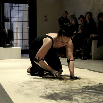 Fulcro della serata alle 18.30 è la performance NON SEI PIÙ TU, AZIONE 02, a cura di Silvia Grandi e Fabiola Naldi, che Giovanna Ricotta propone negli spazi della Sala delle Ciminiere: un lungo tappeto di carta di cotone che si dipana nell'ampio salone del museo vedrà il corpo dell'artista procedere più volte in avanti e indietro, tracciando e imprimendo con la sua gestualità e attraverso la polvere di grafite segni astratti che connettono idealmente presente e passato, risalendo fino agli esordi. All'estremità finale di questo percorso, a rappresentare la performance che si stabilizza in un corpo scultura, si trova l'opera Non sei più tu (2015): un'urna nera, dalle forme morbide, realizzata tramite tecniche di stampa 3D. L'enigmatica struttura monocroma occulta volutamente al pubblico il suo contenuto: il “corpo assente”, racchiudendo il nucleo interiore dell'artista, composto di polvere di grafite. A chiudere l'urna, una calotta che, se sollevata, svela il segno grafico GR inciso in oro. Con questo lavoro Giovanna Ricotta ha voluto “fissare un punto d'arrivo e ulteriori passaggi nell'indagare la performance” immaginando che al nero seguano altri monocromi – rosa e bianco - “tre urne, tre forme, tre spostamenti”.