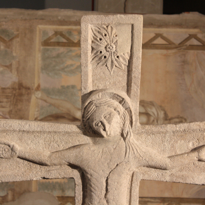 Scolpita su entrambe le facce, la croce ritrovata presenta sul recto la figura di Cristo dal modellato assai contenuto, caratterizzato da incisivi grafismi che rilevano le fisionomie del volto e il gioco delle pieghe del panneggio. Sul verso invece la scultura è impreziosita da sinuosi ed eleganti tralci d’acanto, intervallati da fiori e da elementi vitinei posti a cornice della mano di Dio benedicente, ormai non più leggibile. Tali motivi decorativi richiamano modelli antichi o tardoantichi, reinterpretati con una verve esecutiva che trova un riscontro in certi repertori della coeva miniatura.