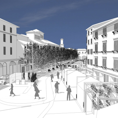 La nuova piazza Aldrovandi vedrà l'eliminazione dei parcheggi fra i chioschi in modo da liberare la visuale tra il portico e la piazza e permettere una completa permeabilità degli spazi per chi si muove a piedi, in particolare anziani, bambini e genitori con carrozzine.