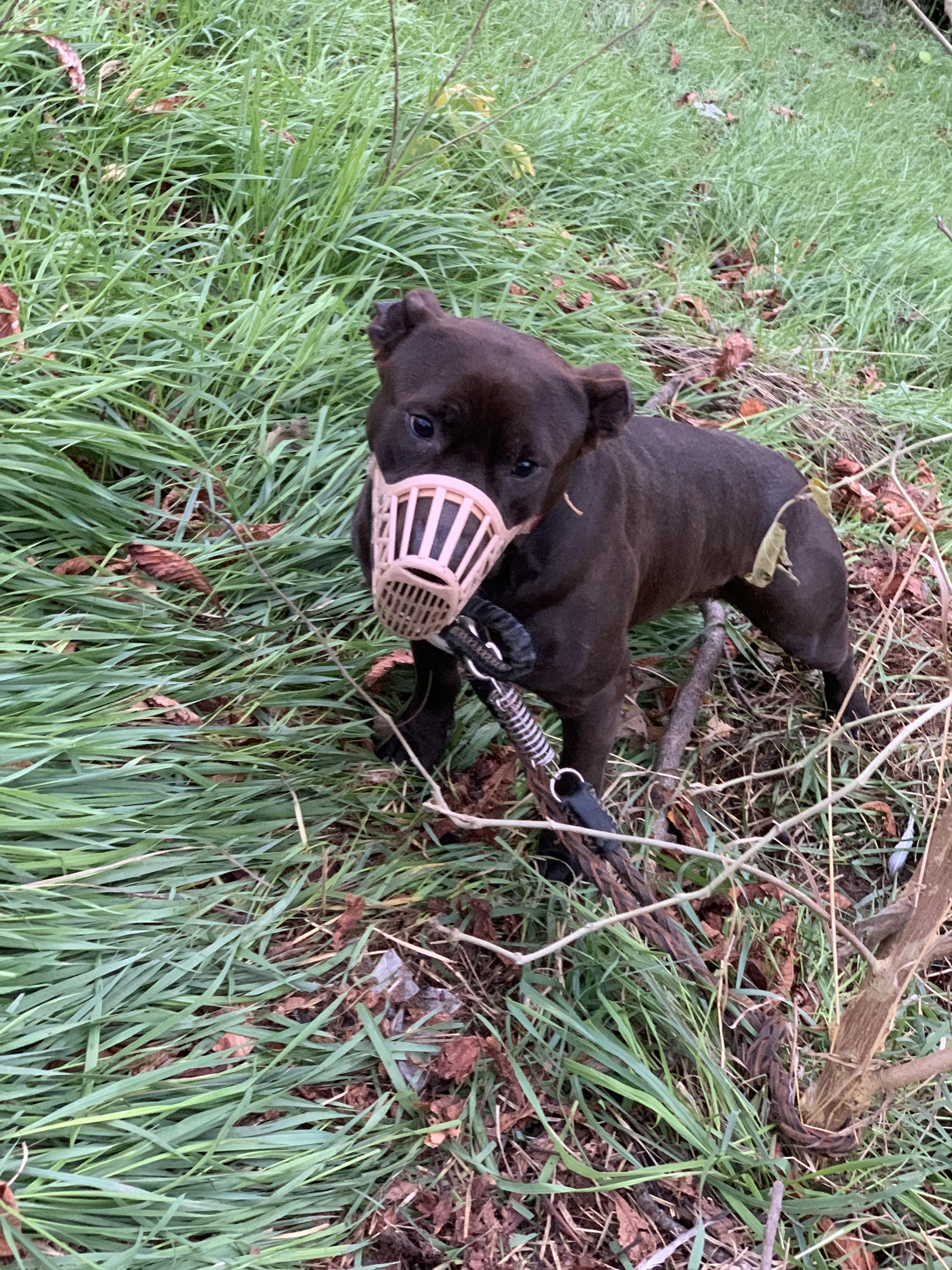Il pitbull di taglia media era legato ad un arbusto con il guinzaglio e la museruola