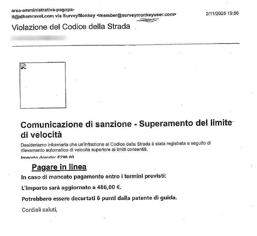 Nell’ultimo periodo si sta verificando un tentativo di truffa che viene veicolato agli utenti in modalità online. Si tratta dell’invio di una mail dove viene richiesto l’immediato pagamento, sempre in modalità online, di un verbale che fa riferimento ad una violazione del codice della strada non meglio identificata.