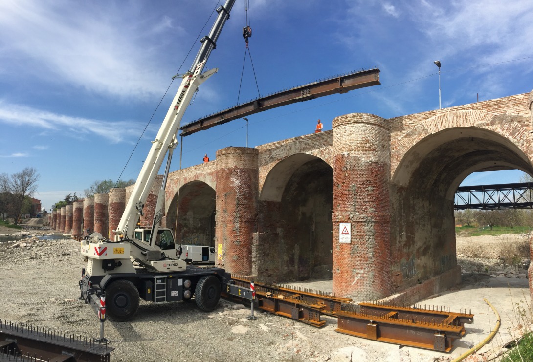- miglioramento del comportamento sismico dell’opera grazie all’alleggerimento dell’impalcato, ovvero lo svuotamento e alleggerimento della struttura esistente e alla realizzazione di un nuovo impalcato in acciaio, più leggero, poggiato su pulvini realizzati al di sopra delle pile;