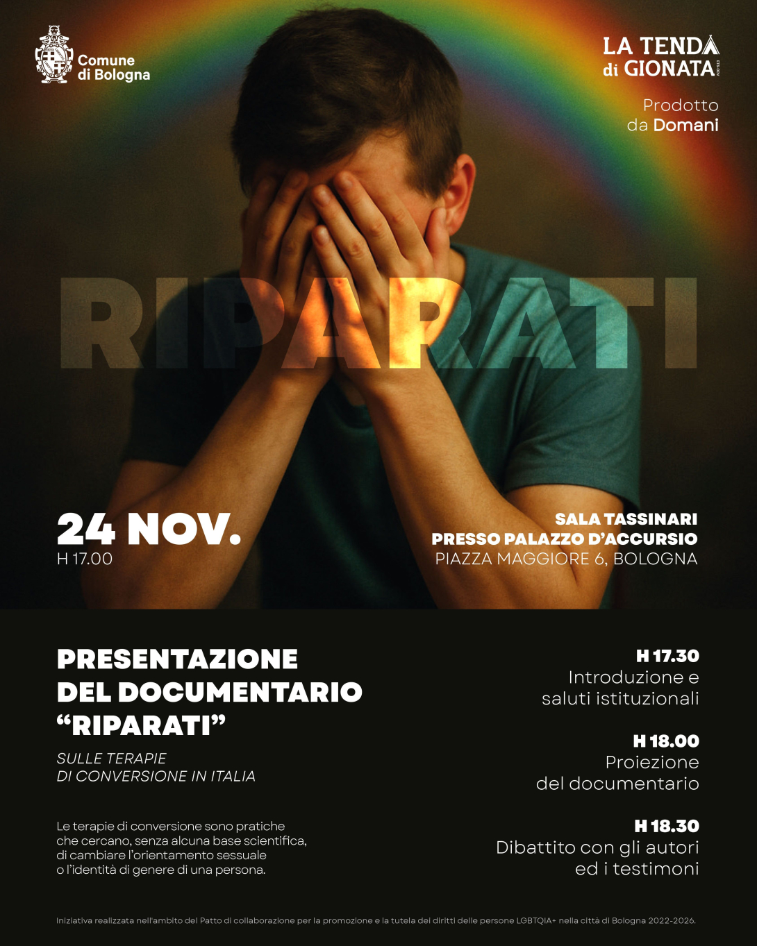 Lunedì 24 novembre alle 17.30, in sala Tassinari a palazzo d’Accursio, sarà presentato il documentario “Riparati - la chiesa, l’omosessualità e la violenza delle terapie di conversione”, a cura de La Tenda di Gionata, associazione nazionale per l’accoglienza e l’accompagnamento dei cristiani LGBT, dei loro familiari e degli operatori pastorali.