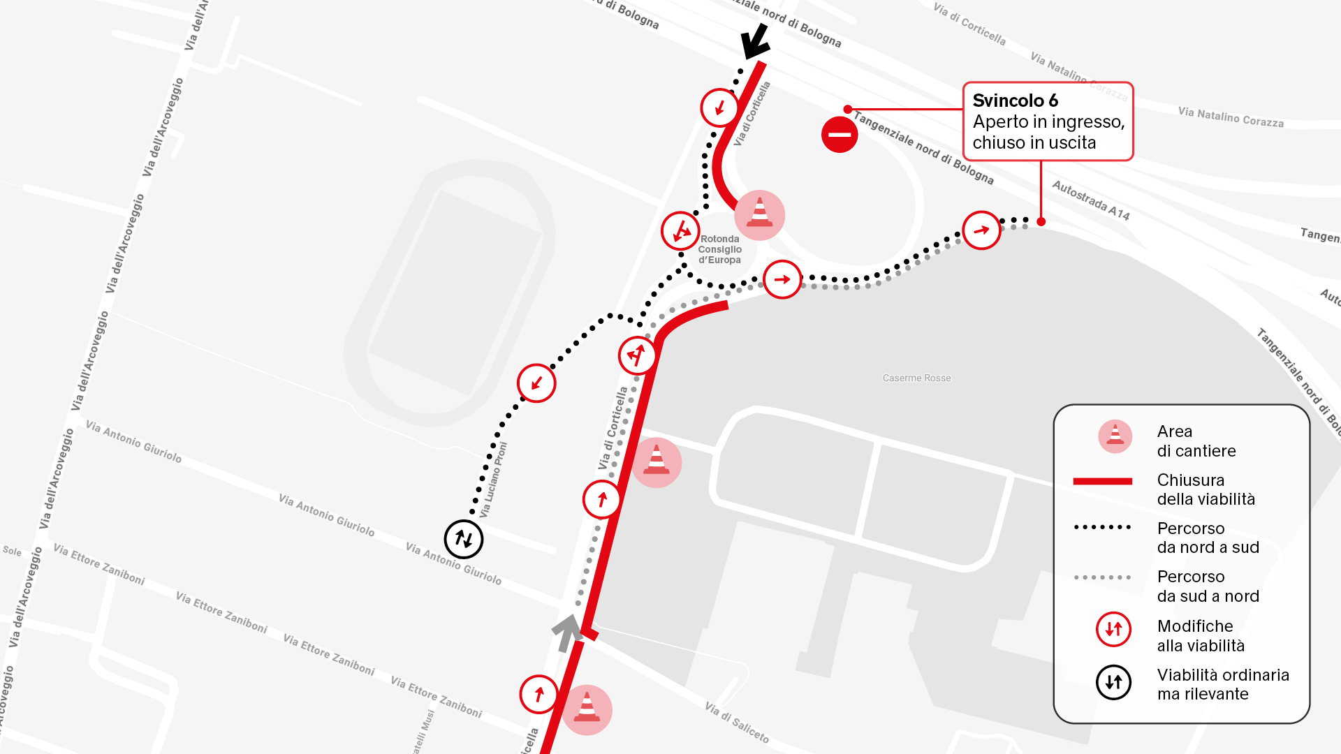 Il tratto interessato di via di Corticella – compreso tra via di Saliceto e la rotonda Consiglio d’Europa, dove si sta realizzando il sottopasso tranviario – diventa di conseguenza percorribile soltanto verso periferia; la circolazione verso il centro, invece, viene deviata su via Proni, a senso unico in direzione Giuriolo ad eccezione del segmento finale, così da consentire l’ingresso nel parcheggio del centro commerciale La Corte. Infine, chi percorre via di Corticella provenendo da nord potrà immettersi nella tangenziale o proseguire verso centro attraverso via Proni.