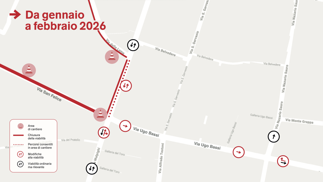 Con la riapertura di via Indipendenza alle spalle, si intensificano le attività su via Marconi, dove il cantiere si prepara ad essere riallestito continuando a interessare l’incrocio con Ugo Bassi e San Felice, ma in un nuovo assetto. Le operazioni inizieranno il 12 gennaio con lo smantellamento delle recinzioni su Ugo Bassi, senza modifiche alla circolazione, che resterà a senso unico verso il centro. Anche lo spostamento del cantiere di via Marconi dal lato est a quello ovest non comporterà alterazioni alla viabilità, salvo restringimenti di carreggiata. Lo stesso vale per i lavori su via delle Lame, il cui trasferimento sul lato opposto è però calendarizzato dalla settimana successiva.